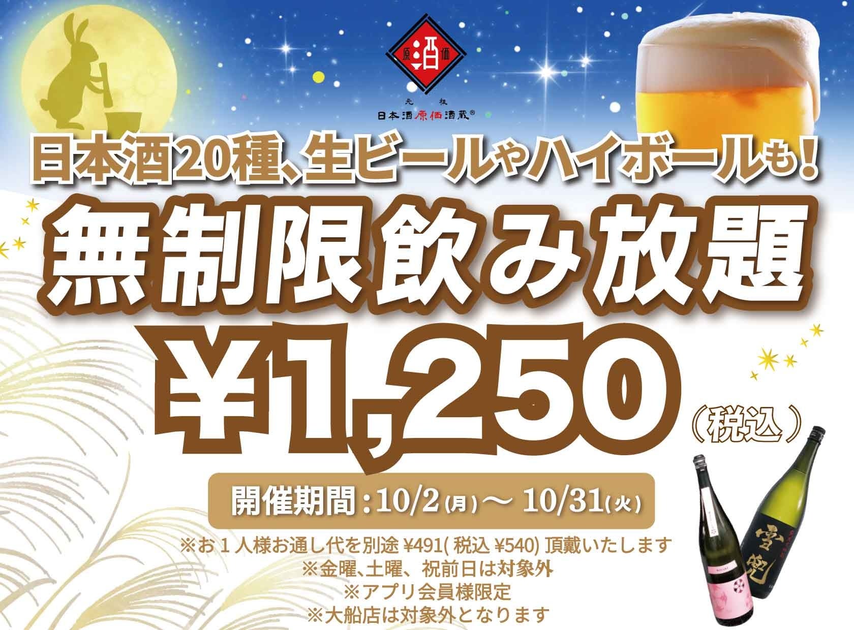 10月2日(月)~10月31日(火)に日本酒原価酒蔵にて時間無制限飲み放題¥1,250(税込)を開催します。