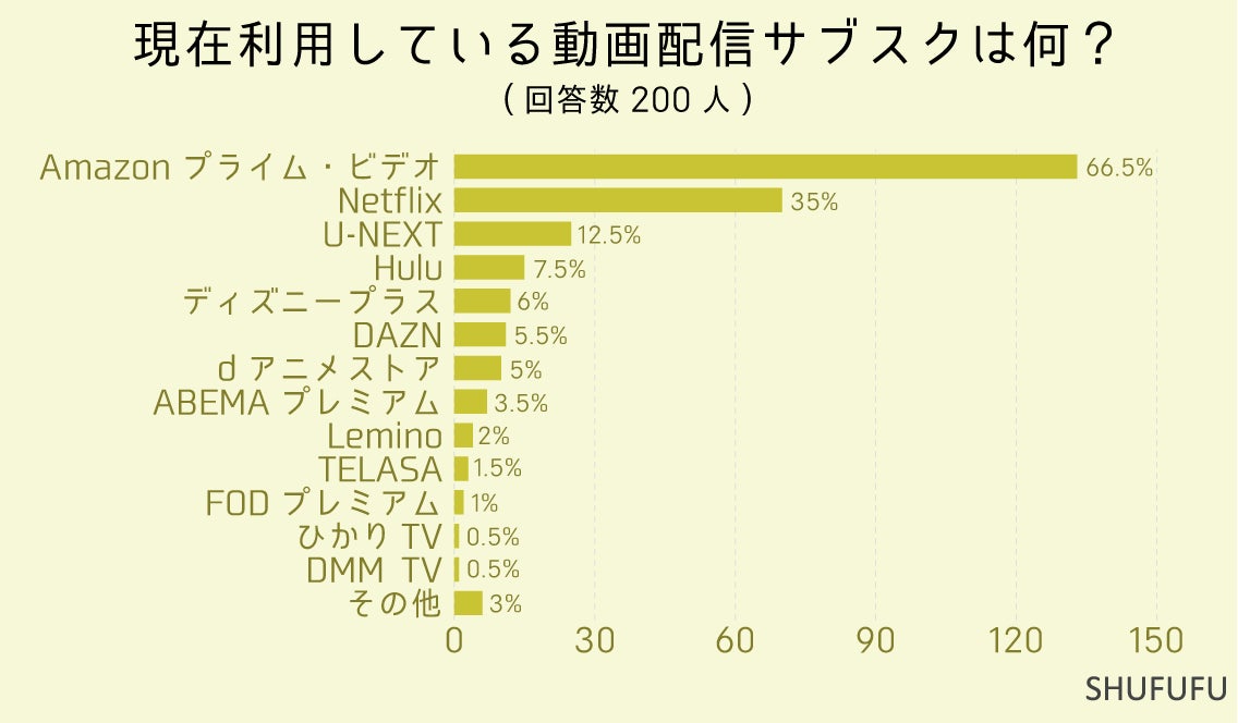 現在利用している動画配信サブスクに関しては1位「Amazonプライム・ビデオ(66.5%)」、2位「Netflix(35%)」でした。1位と2位の差が倍近くありました。