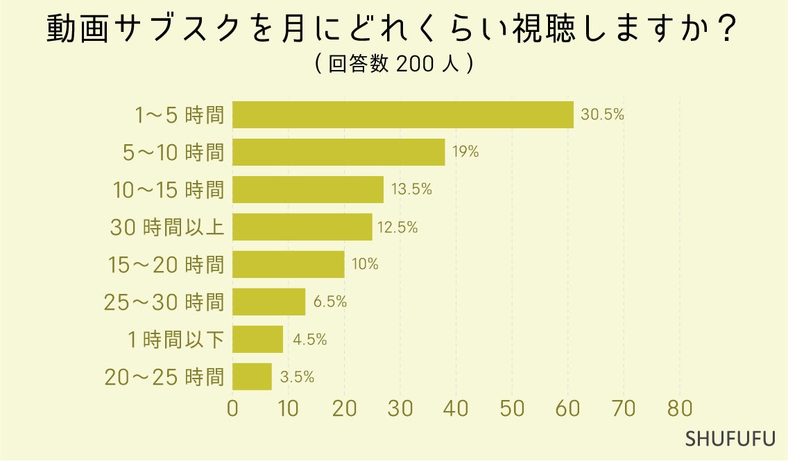動画サブスクを月にどれくらい視聴しますか?の問いに対して最も多かったのが「1〜5時間(30.5%)」でした。 次いで「5〜10時間(19%)」「10〜15時間(13.5%)」という結果でした。