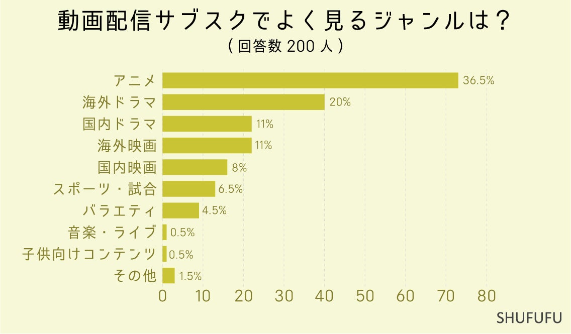 動画配信サブスクでよく見るジャンルを尋ねたところ、1位は「アニメ(36.5%)」、2位「海外ドラマ(20%)」となりました。3人に1人はよくアニメを見ている計算になりますね