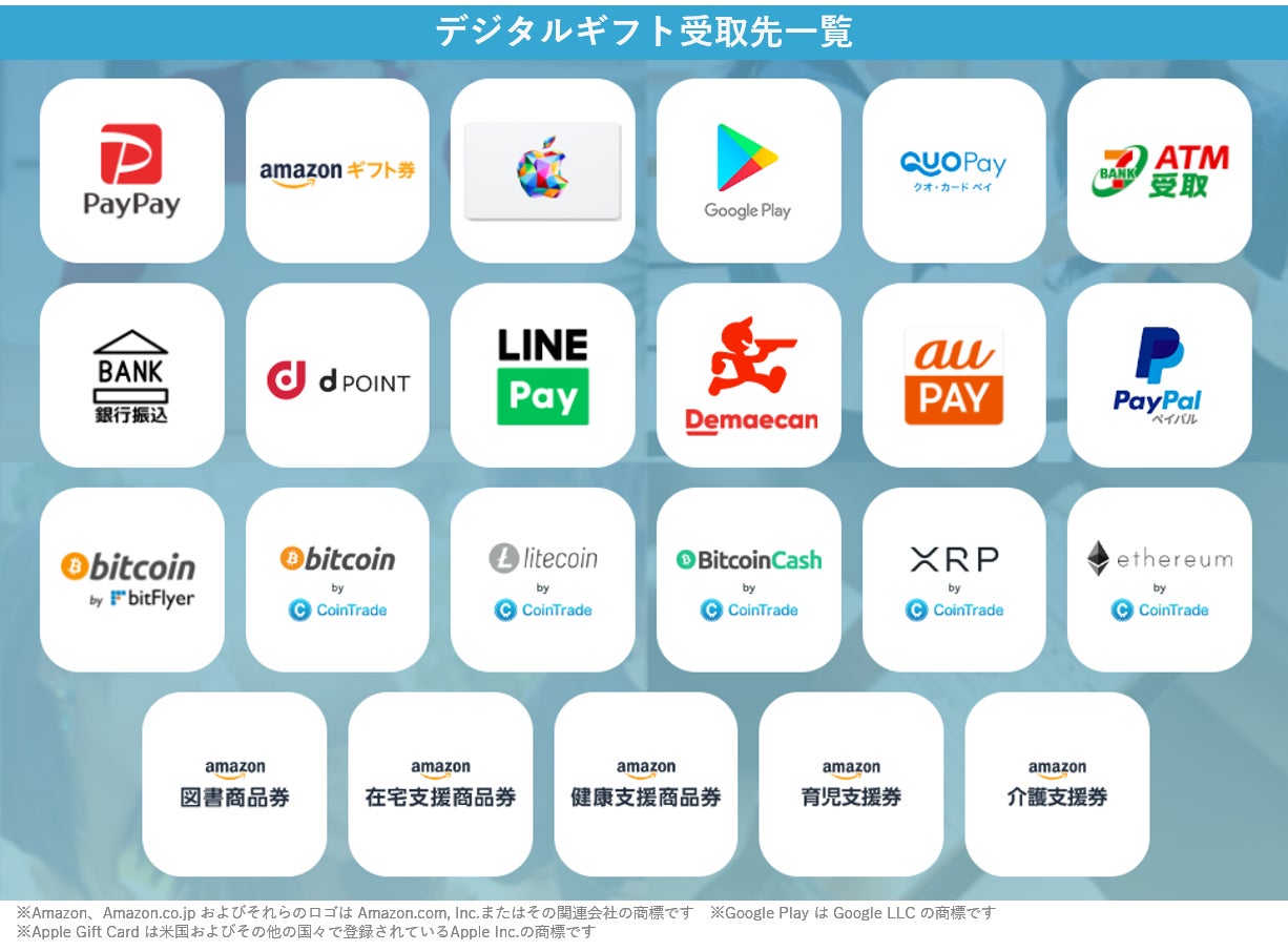 アンケート回答、資料請求、お見積もりの謝礼、社内イベントのインセンティブ、etc.