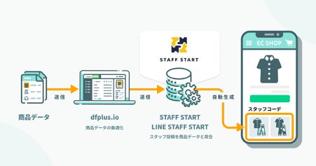 今回の対応により、STAFF STARTを導入する企業は、dfplus.ioを利用することで、自社ECサイトの商品データを、開発不要で*2 簡単にSTAFF STARTに連携することが可能です。準備期間は、平均的には約1~2週間、最短で即日の準備も可能となり、費用は月額3万円~ と、準備のための期間やコストをおさえて手軽にSTAFF STARTを導入することができます。