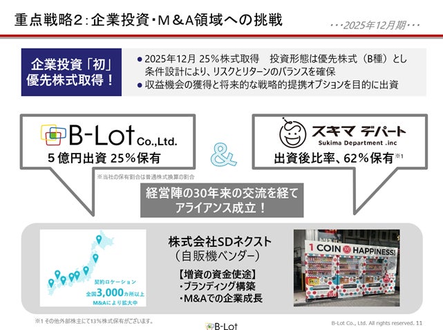 こうした方針のもと、2025年12月、全国3,000カ所超のロケーションを有する自動販売機事業を手掛ける株式会社SDネクストへの投資機会を獲得いたしました。