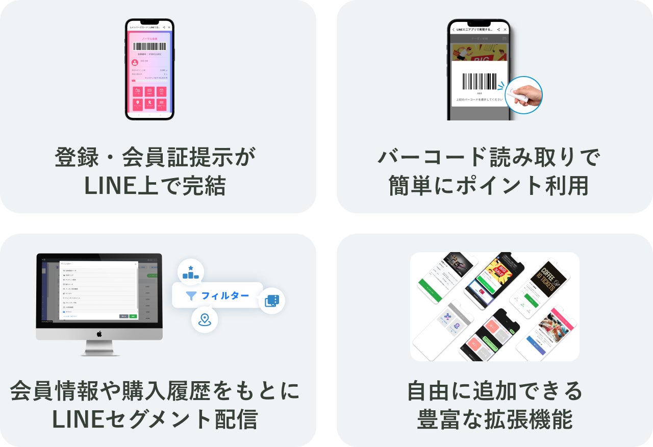 Lメンバーズカードでは、「デジタル会員証」「LINEメッセージ配信」「顧客管理・分析」「リピート施策」にそれぞれ特化した基本機能が利用可能です。