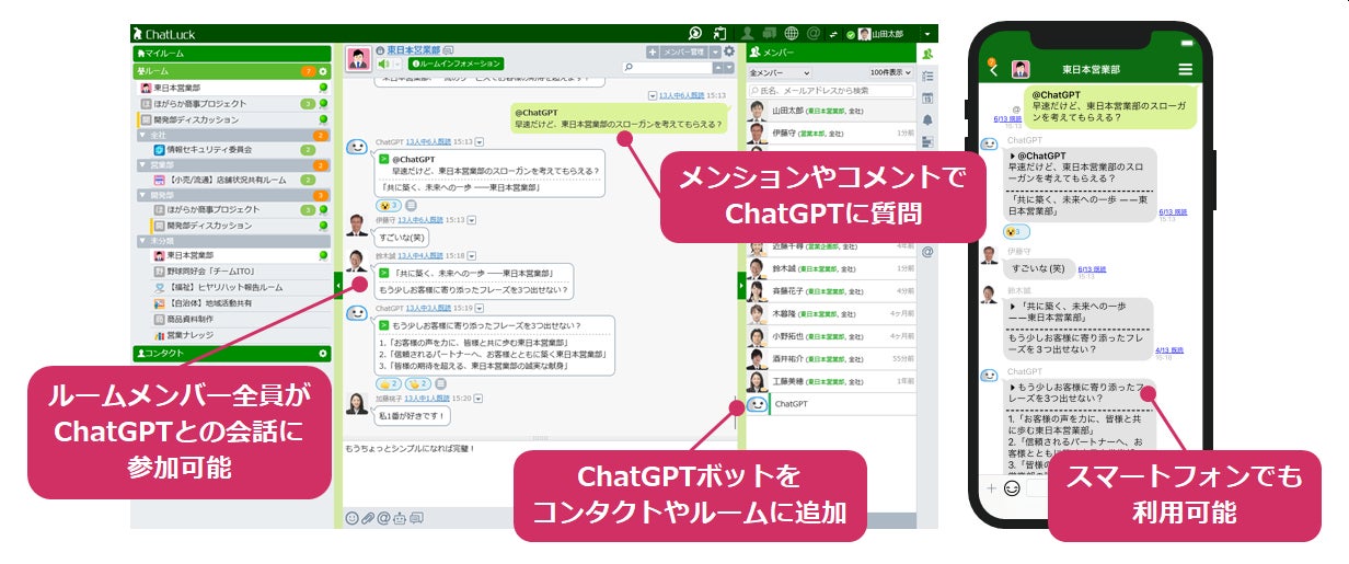チャットボット機能を拡張し、ChatGPTをボットとして利用できるようになりました。ChatGPTをあたかも「1人の社員」として、コミュニケーションの輪に加えることができます。ChatGPTボットとの会話内容が外部に記録・学習・再利用されることはありません。