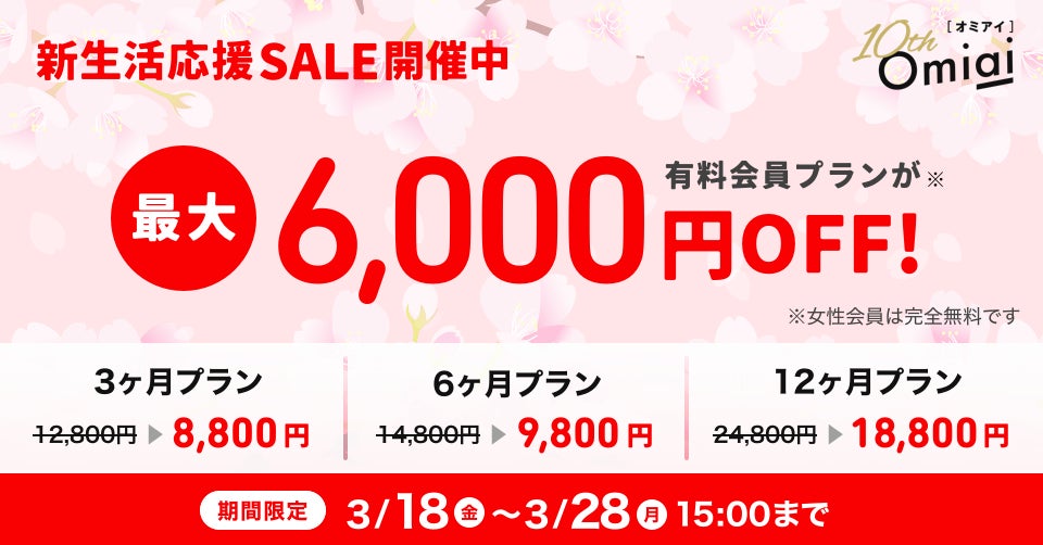 Omiaiでは、そんな春に恋をしたいと考える方を対象に「新生活応援SALE」を期間限定2022年3月18日(金)~3月28日(月)15時まで開催いたします。男性有料会員プランが最大6,000円引きになるこのチャンスに、ぜひOmiaiで新生活の恋を探してみませんか。