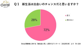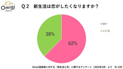 Omiai登録者を対象に「新生活と恋」に関するアンケートを行ったところ、新生活は出会いのチャンスだと考える方はなんと72%、恋がしたくなると答えた方も62%にのぼりました。「春はなんとなく恋をしたい気持ちになることが多い」「新しい始まりに素敵な人と楽しい日々を送りたい」「環境が変わるので、新しい出会いがある」という、春の陽気ならではの理由をあげる意見が多くよせられました。