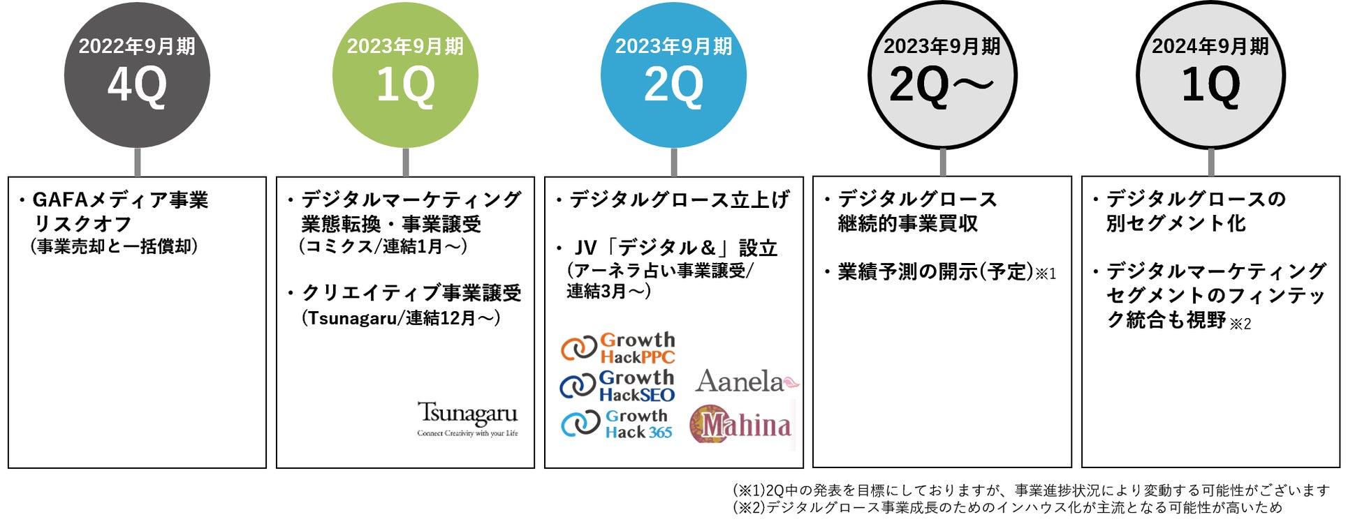 事業買収(M&A及びJV)に対して、フィンテック事業・デジタルマーケティング事業をかけあわせることで、新たなキャッシュフローを生み出すデジタルグロース事業を新設いたします。今後は業績予想の開示を行えるようにすべく、デジタルグロース事業の位置付けに合致するビジネスを業種業態問わずに展開を検討し推進、2024年9月期には、デジタルグロースを第3の収益の柱として、独立したセグメントにする予定でございます。