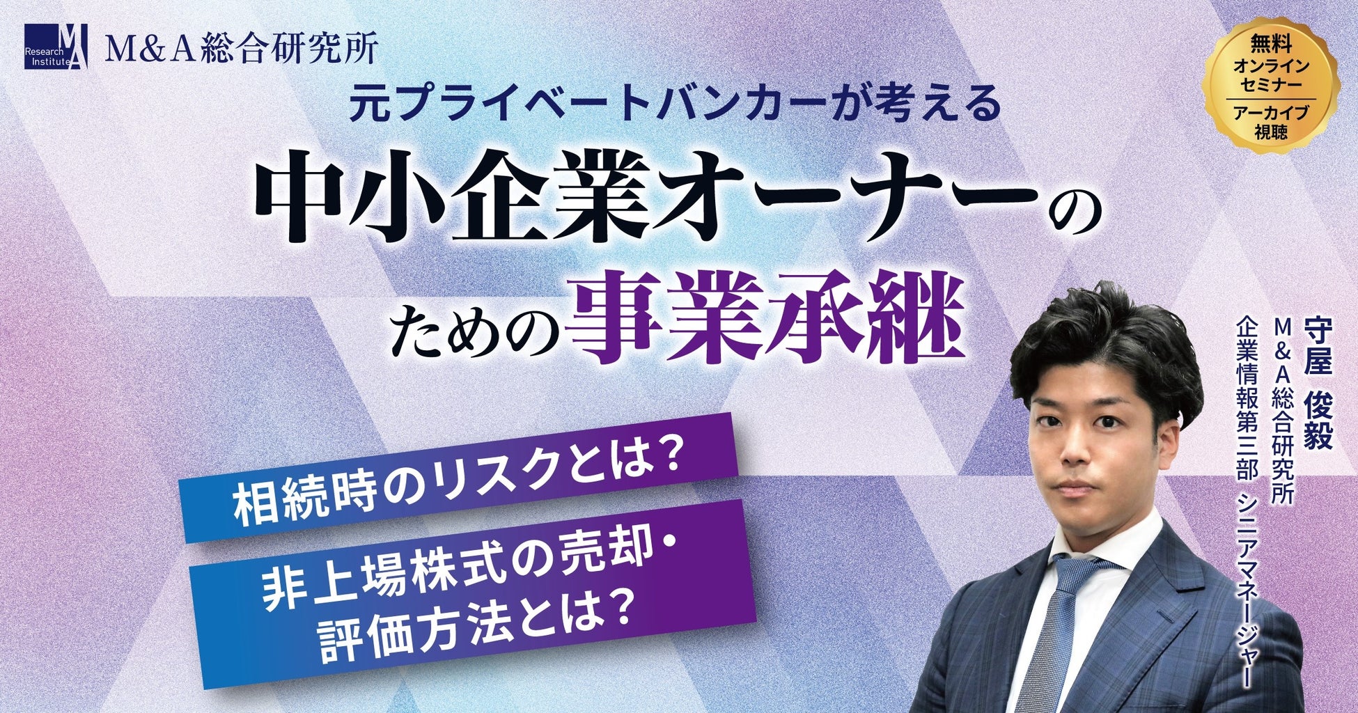 株式会社M&A総合研究所(本社:東京都千代田区、代表取締役社長:佐上 峻作、以下「当社」)は、中小企業オーナー向けの事業承継セミナーを実施し、アーカイブ視聴が可能になりましたのでお知らせいたします。