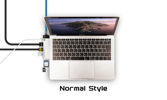 Thunderbolt 3ポート × 2が両端にあるMacBook Proなら、挿しこみ方法は4種類。ディスプレイの位置やEthernetケーブル、SDカードの使用頻度に合わせて任意の方向から抜き差し可能です。なお、Thunderbolt 3ポートが左側にのみ搭載されているMacBook Airの場合も左側に正逆、いずれの挿しこみ方にも対応しています。