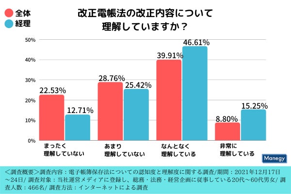 最も多かった回答は「なんとなく理解している(管理部門従事者全体:39.91%、経理部門:46.61%)」となり、「理解していない」という回答の項目では管理部門従事者全体で51.29%、経理部門の方で38.14%となりました。
