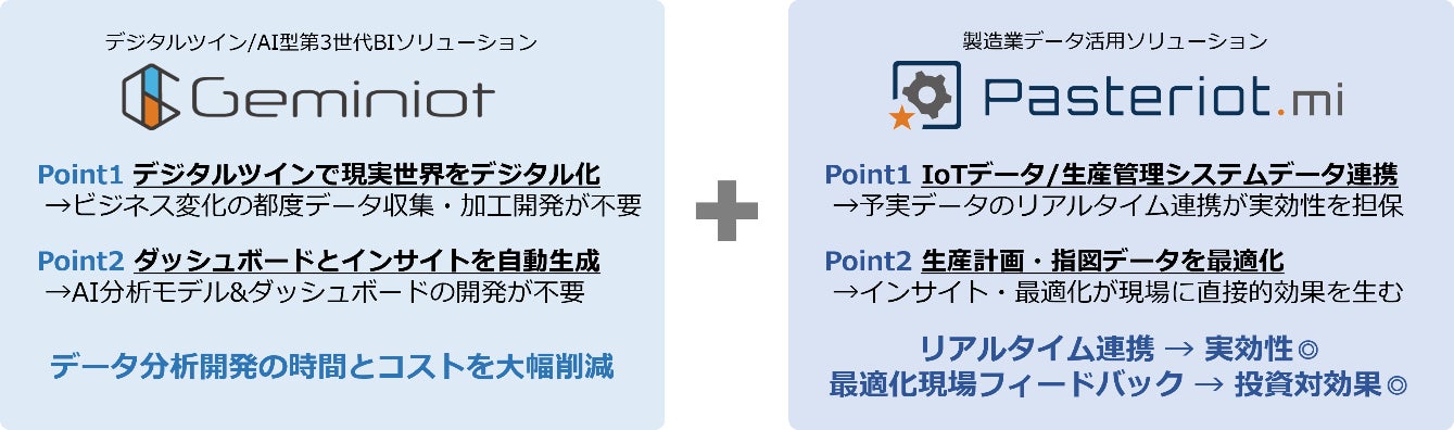 DTSブースでは、AI搭載のビジネス・インテリジェンス(以下、BI)ソリューション「Geminiot(ジェミニオ)」と、製造業向けのインタフェースを追加した「Pasteriot.mi(パステリオ エムアイ)」をご紹介します。Geminiot/Pasteriot.miでは、分析モデルとダッシュボードをAIが自動生成。従来専門家が行っていた領域をAIが担うため、専門知識が無くてもデータ分析が可能となります。さらに、伴走支援チームがデータ活用に関わる環境の整備から分析施策の立案、ツールや機能の技術的な支援まで、お客様の課題に応じて業務改善の成功を後押しします。