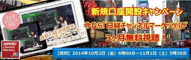 当社では2014年10月3日(金)より新規に口座開設頂いたお客様を対象に、「日経チャンネルマーケット」が最大で3ヶ月間無料で視聴頂けるキャンペーンを実施いたします。