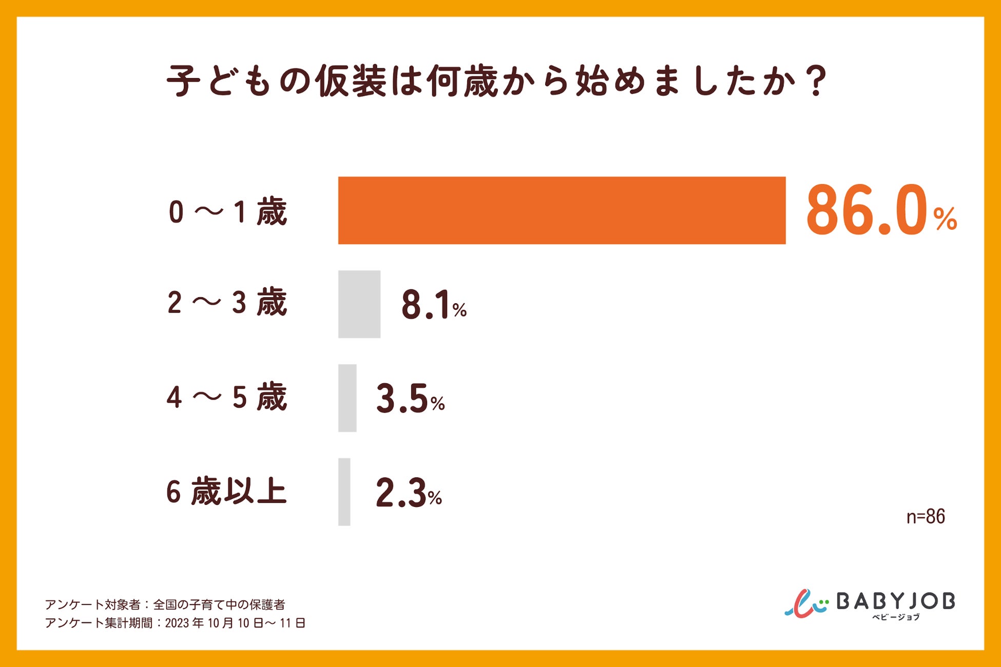 「子どもの仮装は何歳から始めましたか?」という質問に対して、86.0%もの保護者が「0~1歳から始めた」と回答しており、多くの保護者が3歳以下のうちに仮装を始めることがわかりました。