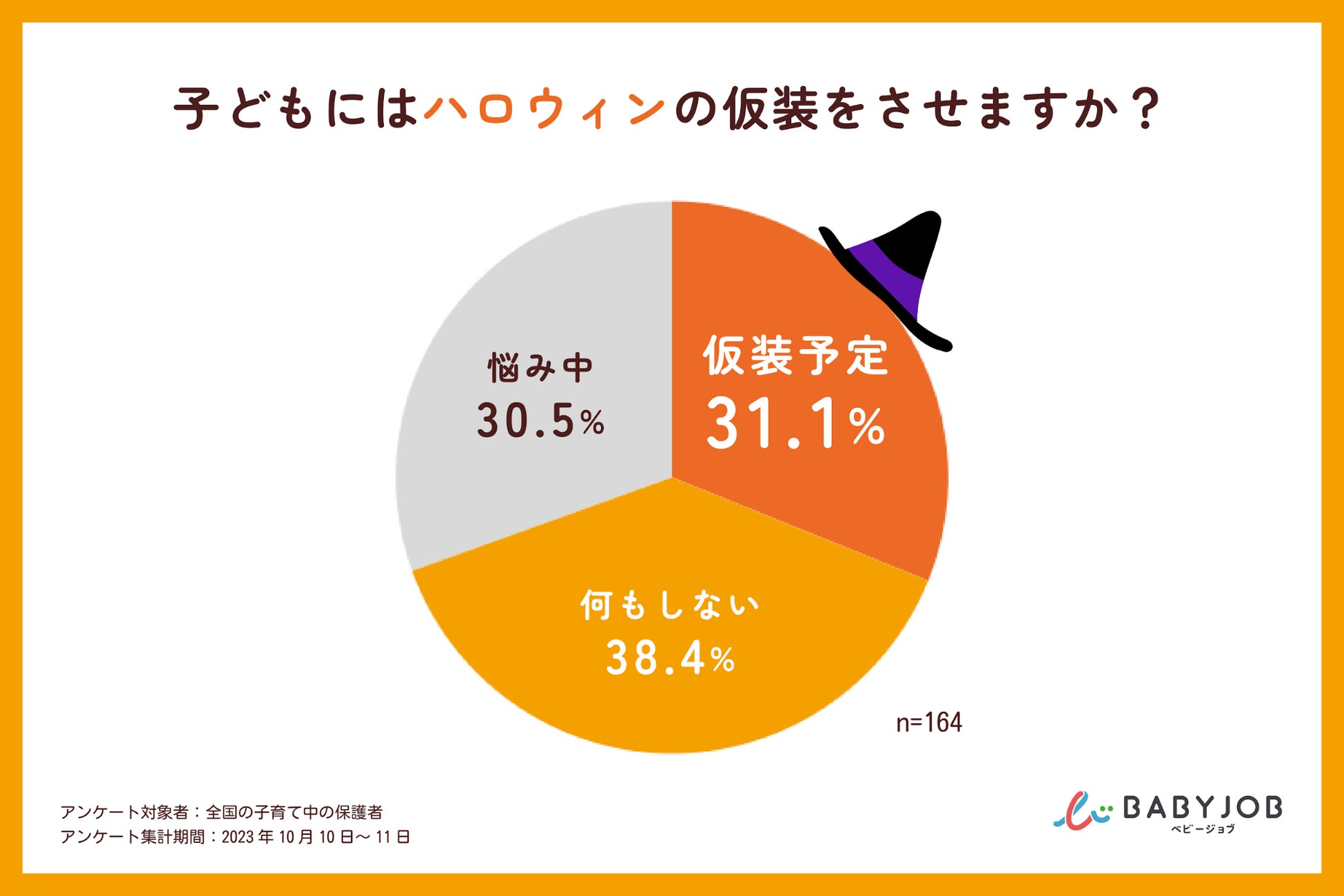 一方で子育てをする保護者164名に対して、子どもにハロウィンの仮装をさせる予定かどうか質問したところ、「仮装させる予定」と答えたのは31.1%で、「仮装させない予定」「悩んでいる」と答えた保護者の方が多い結果となりました。
