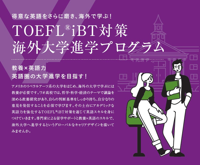 アメリカのリベラルアーツ系の大学をはじめ、海外の大学で学ぶには教養が必要です。ワオ高校では、哲学・科学・経済のテーマで議論を深める教養探究があり、自らの判断基準をしっかり持ち、自分なりの意見を発信することを必須で学びます。その土台にアカデミックな英語力を強化するTOEFL®iBT対策を通じて英語スキルを身につけていきます。専門家による留学サポートと教養×英語のスキルで、海外大学へ進学するというグローバルなキャリアデザインを描いてみませんか。