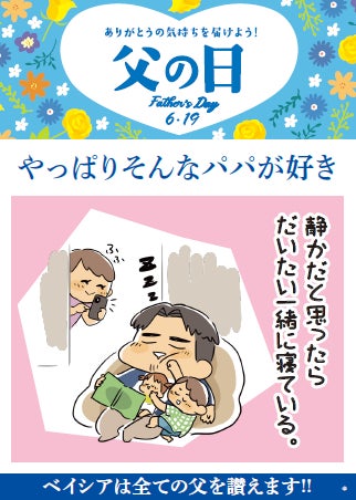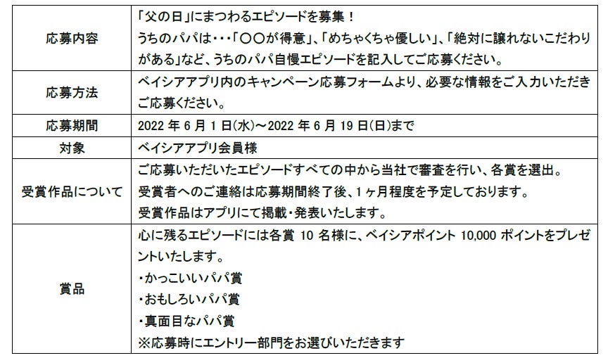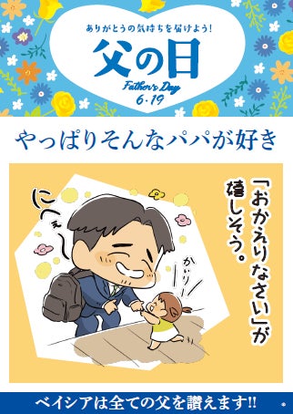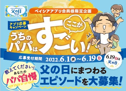 株式会社ベイシア(本社:群馬県前橋市、代表取締役社長:橋本浩英)は、6月1日(水)~6月19日(日)の期間で、「うちのパパはここがすごい!」と題して、「うちのパパ自慢エピソード」をベイシアアプリ内で募集いたします。ご応募いただいたエピソードの中から心に残るエピソード各賞を選出し、賞品としてベイシアポイントをプレゼントいたします。また店内各所では家族の日常の一コマをイラストでご紹介し、父の日を盛り上げます。ぜひ今年の父の日はベイシアと一緒にお父さんへ「ありがとう」の気持ちを届けましょう。