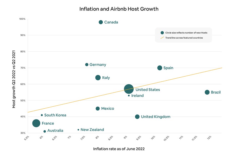 2:インフレデータは、TradingEconomics.comが提供する各国の公開データに基づくものです。Airbnb Hostデータは、2022年第2四半期と2021年第2四半期を比較したAirbnbアクティブコアホストの成長率に基づくものです。