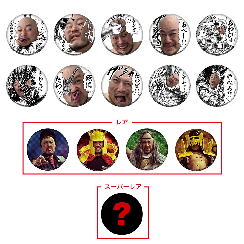 ハリウッドザコシショウ × 北斗の拳 やられ顔缶バッジ全15種 300円(税込)