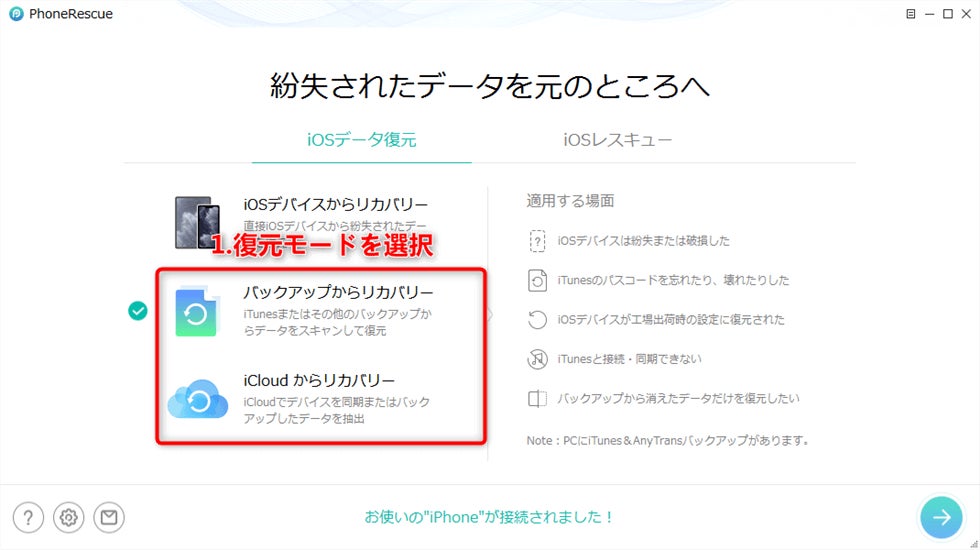 Step 1: iPhoneをUSBケーブルでパソコンに接続して「iTunesバックアップからリカバリー」または「iCloudからリカバリー」モードに入ります。