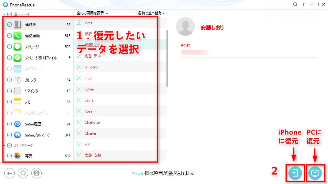 Step 4: 復元可能のデータが表示されて必要なデータを選択し、右下の「デバイスへ」&「PCへ」ボタンをクリックして復元します。