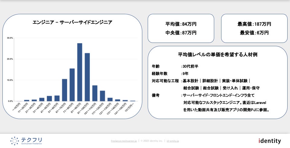 ITフリーランスエンジニアの案件・求人サイト「テクフリ」(https://freelance.techcareer.jp/)を運営する株式会社アイデンティティー(東京都新宿区、以下「当社」)は本日、「ITフリーランスの相場Vol.2 - サーバーサイドエンジニア編」を作成・公開しました。