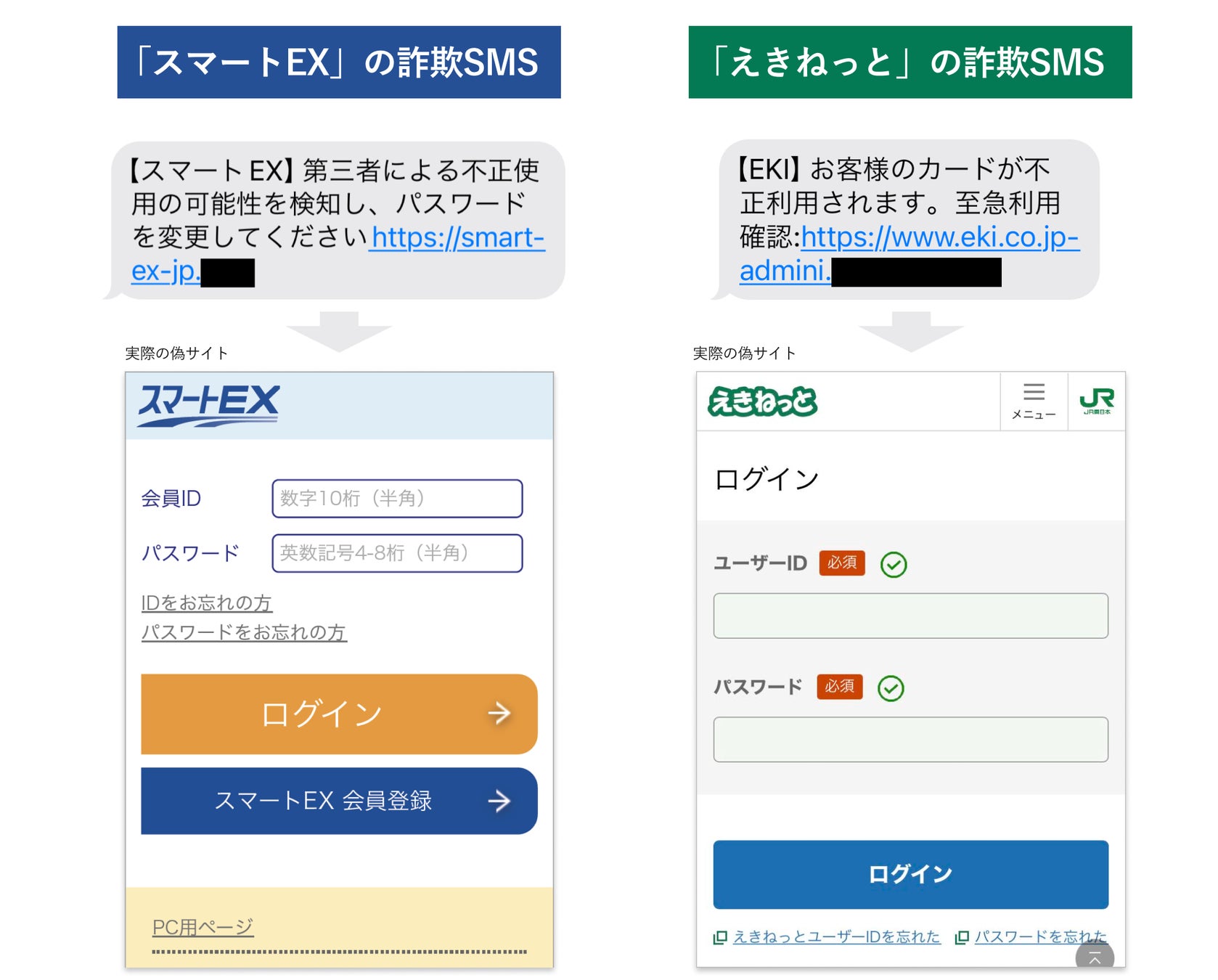 このような状況下で注意したいのが、交通系サービスをかたる詐欺SMSです。2024年2月〜3月は「えきねっと」や「スマートEX」などの交通系サービスをかたるフィッシング詐欺のSMSや偽サイトが発生しています。