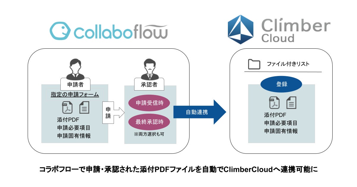 ◎コラボフローで申請・承認された申請書に添付された請求書等のPDFファイルをClimberCloudへ連携する「コラボフロー for クライマークラウド」