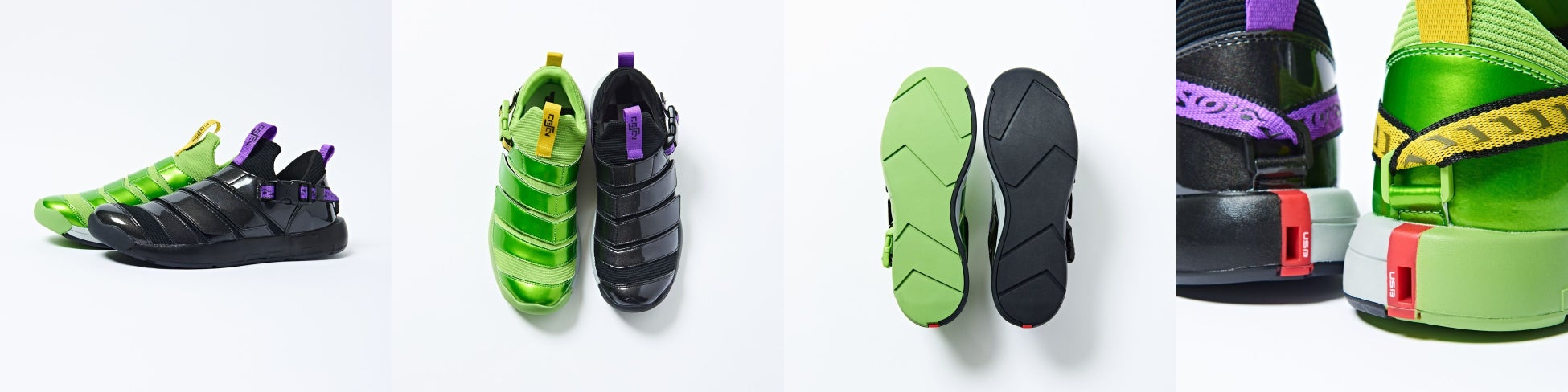 2人で1人の仮面ライダーをオマージュした、ミスマッチスニーカーは、ニットアッパーに光沢のある素材を巻き付ける事で、仮面ライダーWの体のラインを表現しています。スニーカーを並べてヒールから見ると仮面ライダーWの胸のラインが表現されたり、ソールを合わせるとロゴが繋がって見えたりと、左右のスニーカーの組み換えでタウンユースにも遊びの幅が広がるアイテムとなっています。インナーソールには、街を守る2人で1人の仮面ライダーの思考の部屋がそれぞれデザインされています。