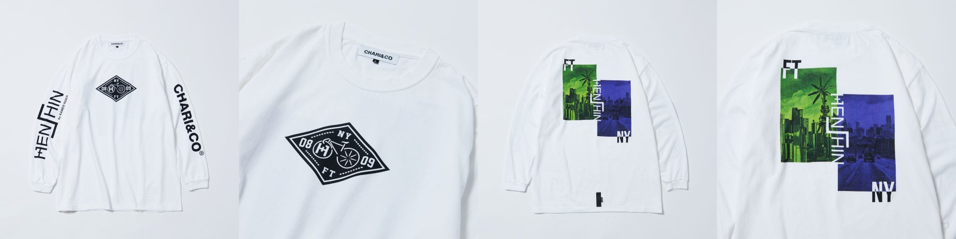 また「HENSHIN by KAMEN RIDER」と「CHARI&CO」の初コラボレーションアイテム『ロングスリーブ Tシャツ』『JET キャップ』も同時リリースいたします。ニューヨークと風都、それぞれの街をテーマにしたデザインとなっています。CHARI&COの自転車ロゴの車輪部分を風都タワーの「風車」とHENSHIN by KAMEN RIDERの「H」マークに見立てたオリジナルマークも作成しました。