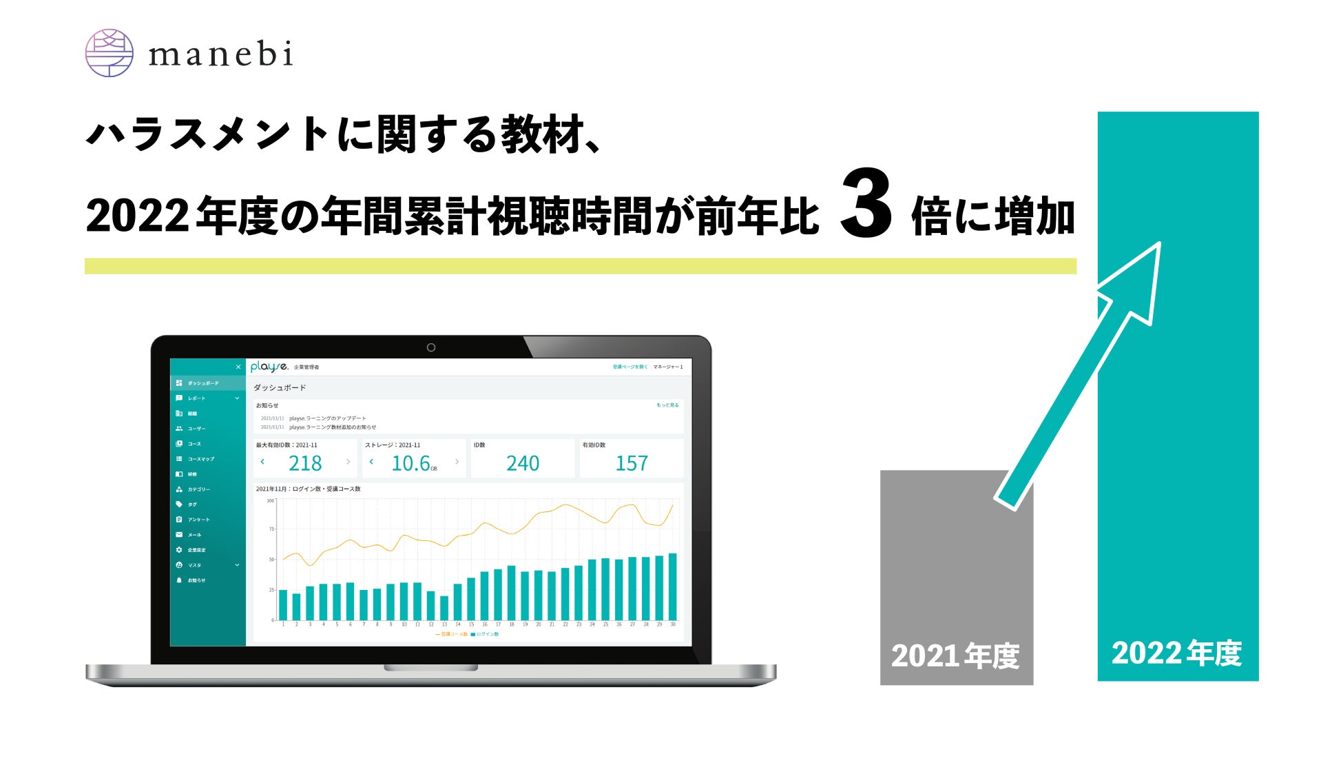 2022年度のハラスメントに関する教材の累計視聴時間は、前年比約3倍に増加