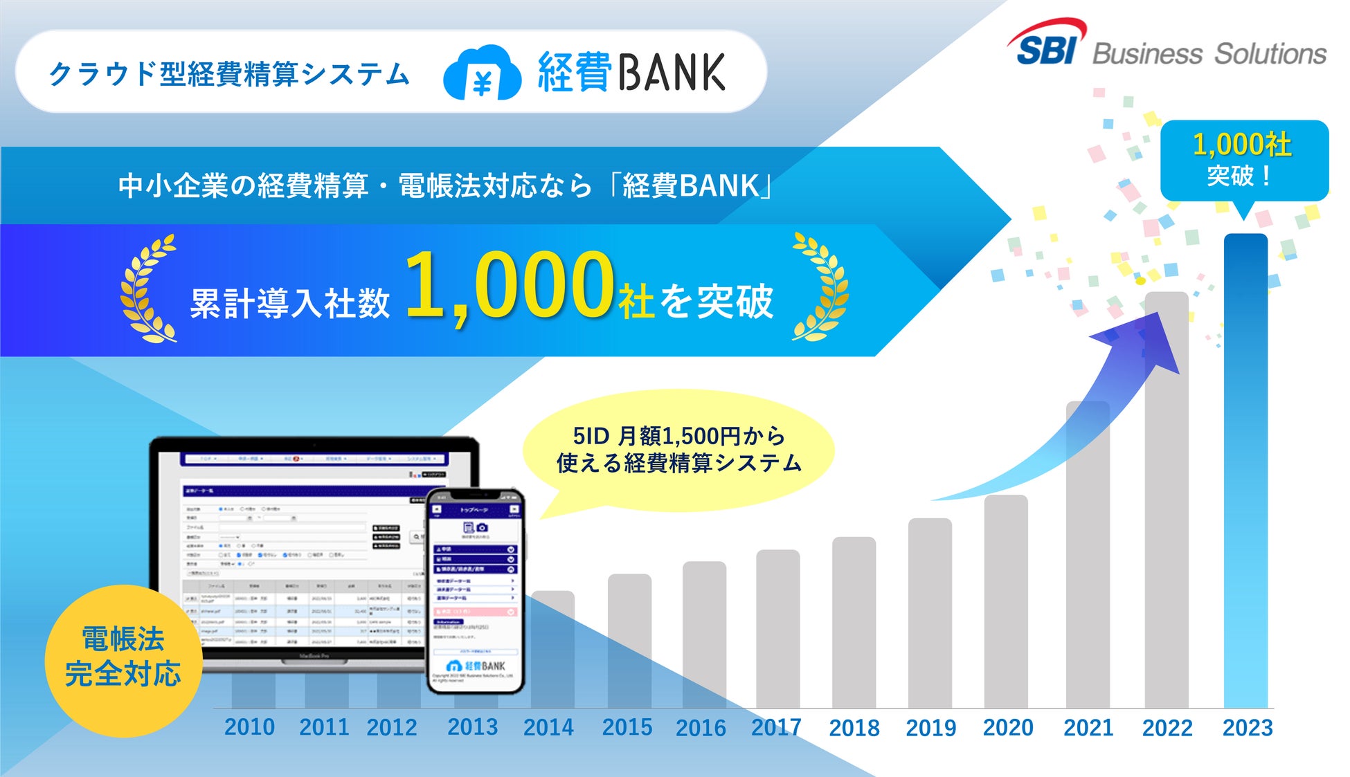 総合フィンテックソリューション企業であるSBI FinTech Solutions株式会社の子会社で、バックオフィス支援サービスを提供するSBIビジネス・ソリューションズ株式会社(本社:東京都港区、代表取締役社長:夏川 雅貴、以下「当社」)は、中小企業の経費精算と電帳法対応をサポートするクラウド型経費精算システム「経費BANK」が、累計導入社数1,000社を突破しましたのでお知らせいたします。