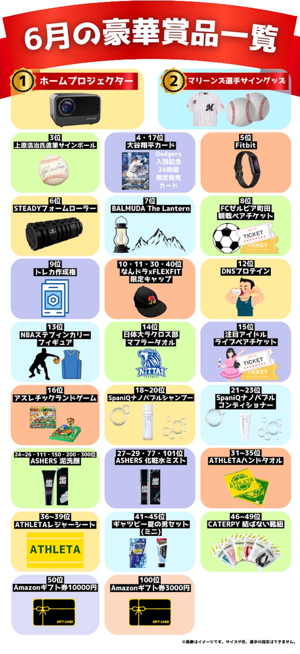 上位50名にはもれなく、そして77位や99位など特定の順位の方にも、大画面でスポーツを楽しめるホームプロジェクターをはじめ、千葉ロッテマリーンズ選手の直筆サイン入りグッズやFC町田ゼルビア観戦チケット、人気家電など、豪華賞品が順位に応じてプレゼント!