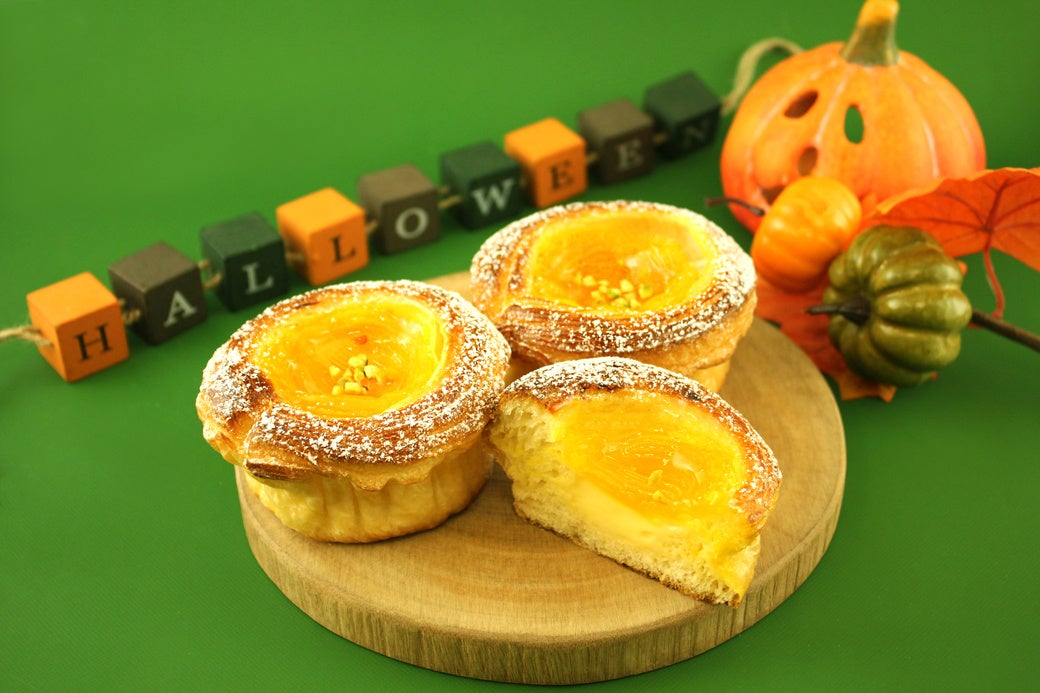 かぼちゃペーストを練り込んだかぼちゃ菓子パンに緑色のクッキーをかぶせ、カスタードホイップを絞り、ジャックオランタンに見立てて焼き上げました。