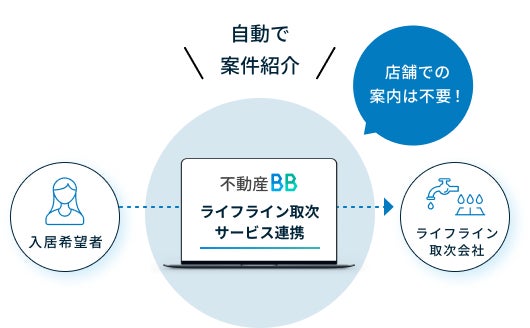 入居者とライフライン取次会社を自動で繋ぐので手間を掛けずに付帯収益を得ることができます。店舗での入居希望者へのライフライン契約の案内業務や、ライフライン取次会社への電話・メール・FAXによる取次業務は一切必要ありません。