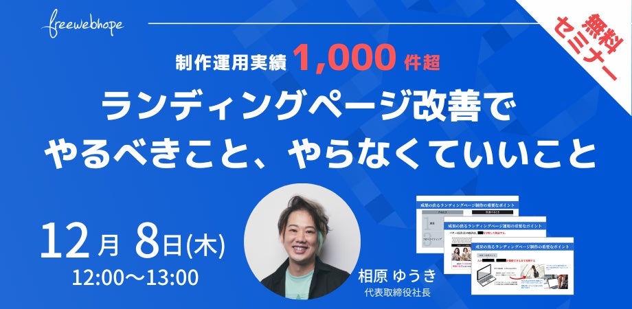 株式会社free web hope(本社:東京都千代田区、代表取締役:相原ゆうき)は、無料のオンラインセミナー「制作運用実績1,000件超 ランディングページ改善でやるべきこと、やらなくていいこと」を12月8日(木)に開催いたします。