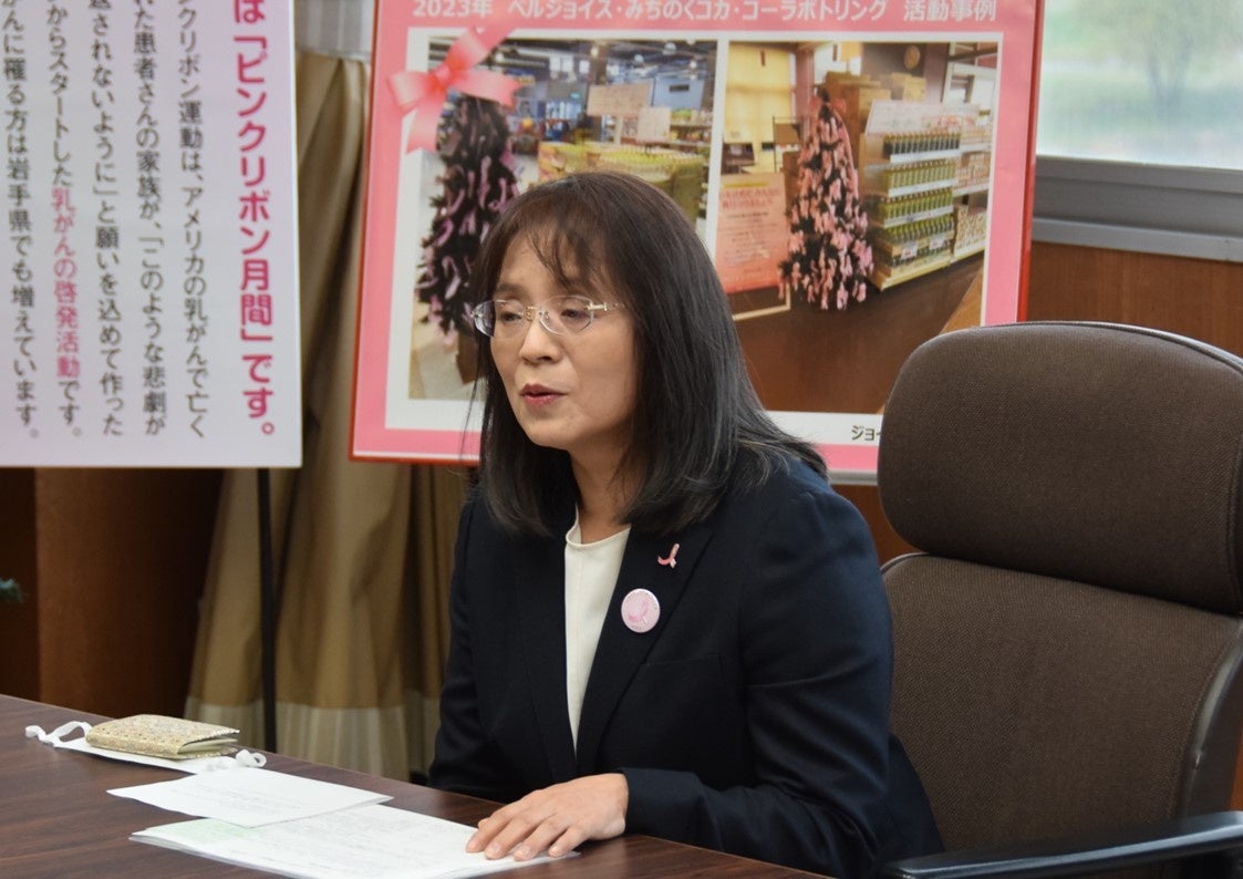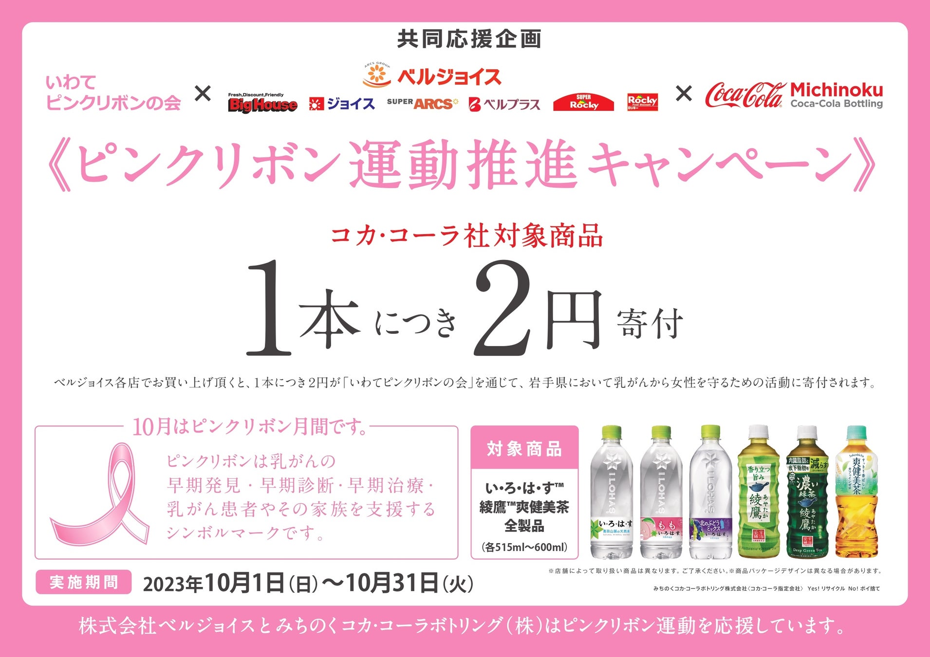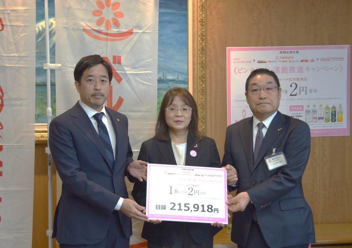 みちのくコカ・コーラボトリング、ベルジョイスとの共同企画「ピンクリボン運動推進キャンペーン」の売上の一部をいわてピンクリボンの会へ寄付