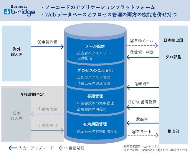 同社はこのたび、製品輸出業務の複雑で多様な業務プロセスに起因する属人化や、それによる非効率化などの課題を解決すべく、業務システム構築ツールであるBusiness b-ridgeを採用しました。