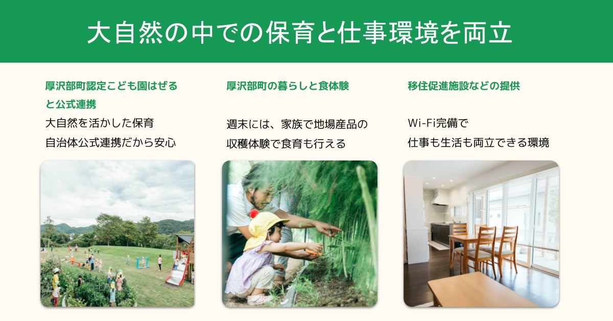 お子様には、幼少期に大自然に触れ、心身ともに健やかに育つ環境を、ご両親は働きながら多様な選択肢を、さらに過疎地域に、子育て家族を招き、地域経済に貢献をもたらします。