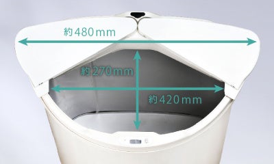 開口はヨコ約42cmタテ約27cmと大きめで、容量47Lで45Lゴミ袋に対応しております。ゴミ袋リング付きなので、袋が外にはみ出ずすっきり収納できます。電源は乾電池(単1形)2本で、最大1年間お使いいただけます(※)