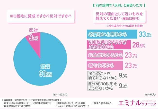 はじめに、「VIO脱毛について賛成か?反対か?」と質問したところ、『賛成(90.3%)』『反対(9.7%)』という結果になりました。