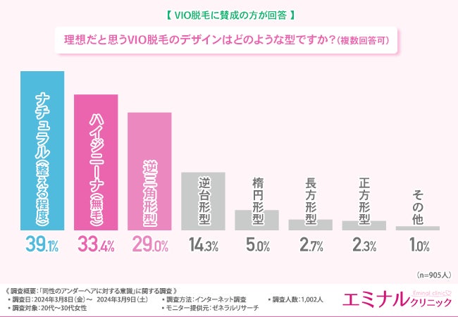 「理想だと思うVIO脱毛のデザインはどのような型ですか?(複数回答可)」と質問したところ、『ナチュラル(整える程度)(39.1%)』と回答した方が最も多く、次いで『ハイジニーナ(無毛)(33.4%)』『逆三角形型(29.0%)』と続きました。