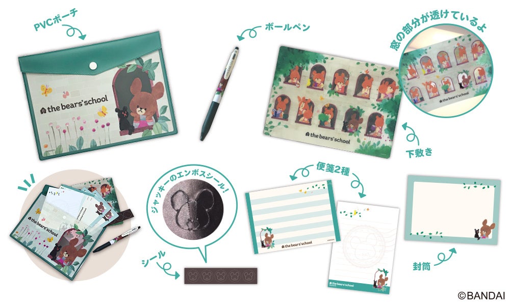 <セット内容>PVCポーチ1個、下じき1枚、ボールペン1本、便箋2種×各10枚、封筒10枚、シール5枚×2シート
