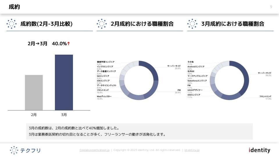 ITフリーランスエンジニアの案件・求人サイト「テクフリ」(https://freelance.techcareer.jp/)を運営する株式会社アイデンティティー(東京都新宿区、代表取締役:今野 力、以下「当社」)は、テクフリのデータベースをもとに2023年3月における案件の市況感を調査しました。より詳しい結果については、お問い合わせから資料請求が可能です。