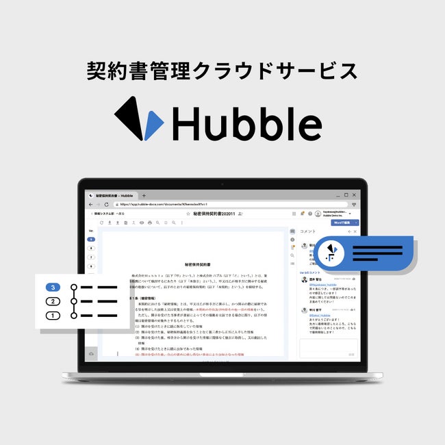東証プライム上場企業からベンチャー企業まで200社以上 累計1.7万人が利用する、“契約業務を、シンプルに、スムーズに。スピーディーでミスのない契約業務フローを実現する“契約書管理クラウドサービスです。契約書作成から締結後の管理まで一気通貫で管理し、契約書作成で発生するバージョン管理やコミュニケーションの履歴など、「誰が、いつ、何を、どこで編集したか」を全てHubbleに蓄積します。また、SlackやTeams、クラウドサインなどとのAPI連携も充実しており、契約業務を効率化し、契約書締結までのコラボレーションを最速化します。期限管理や検索機能も充実しており、強固な契約データベースを築くことが可能です。