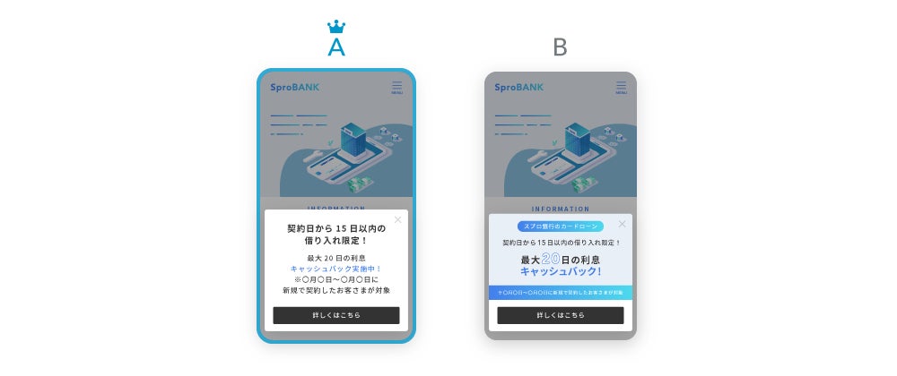 金融機関のサイトで、カードローンの詳細ページへの誘導を促したケースにおいて、テキストのみで訴求したパターンと、画像を用いて訴求したパターンでA/Bテストしました。結果、テキストのみで訴求したパターンの方が効果的でした。