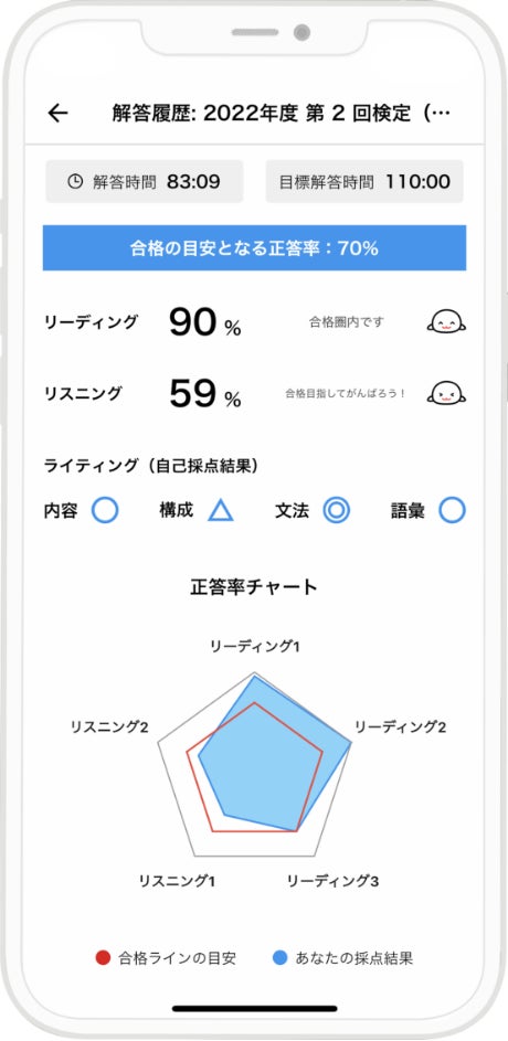 採点完了後の結果画面には、取り組んだ問題の正答率・正答数やレーダーチャート、「あなたの順位」が表示され、苦手分野を把握することができます(※)。また、解答履歴画面から、間違えた問題や自分でチェックを付けた問題を抽出することができるので、すべての問題が正解となるまで解き直すなど、効率的に復習ができます。