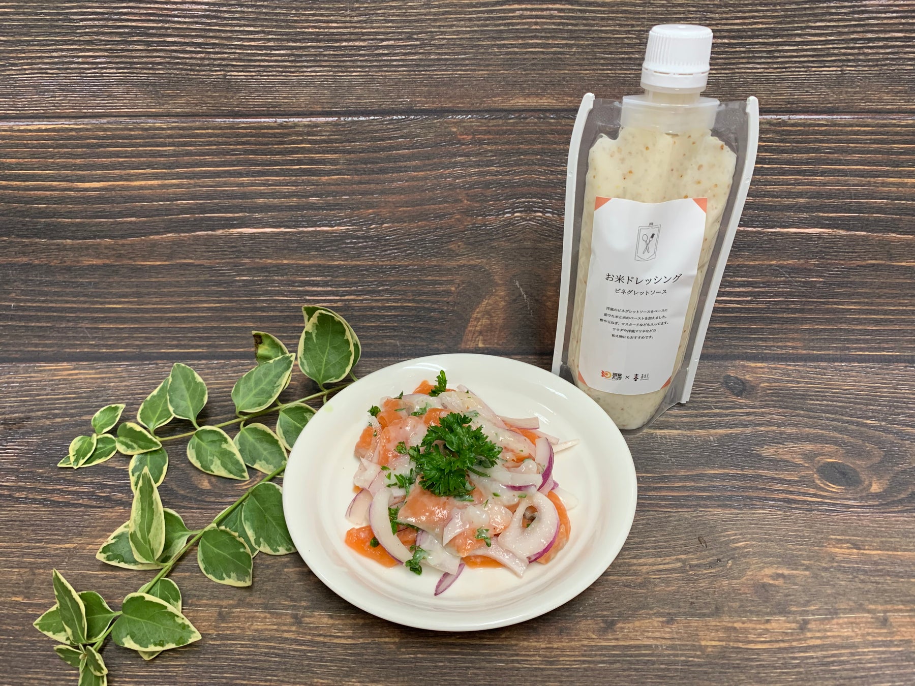 洋風のビネグレットソースをベースに茹でた米と米のペーストを加えました。酢や玉ねぎ、マスタードなどもはいっており、サラダや洋風マリネなどの和え物にもおすすめです。