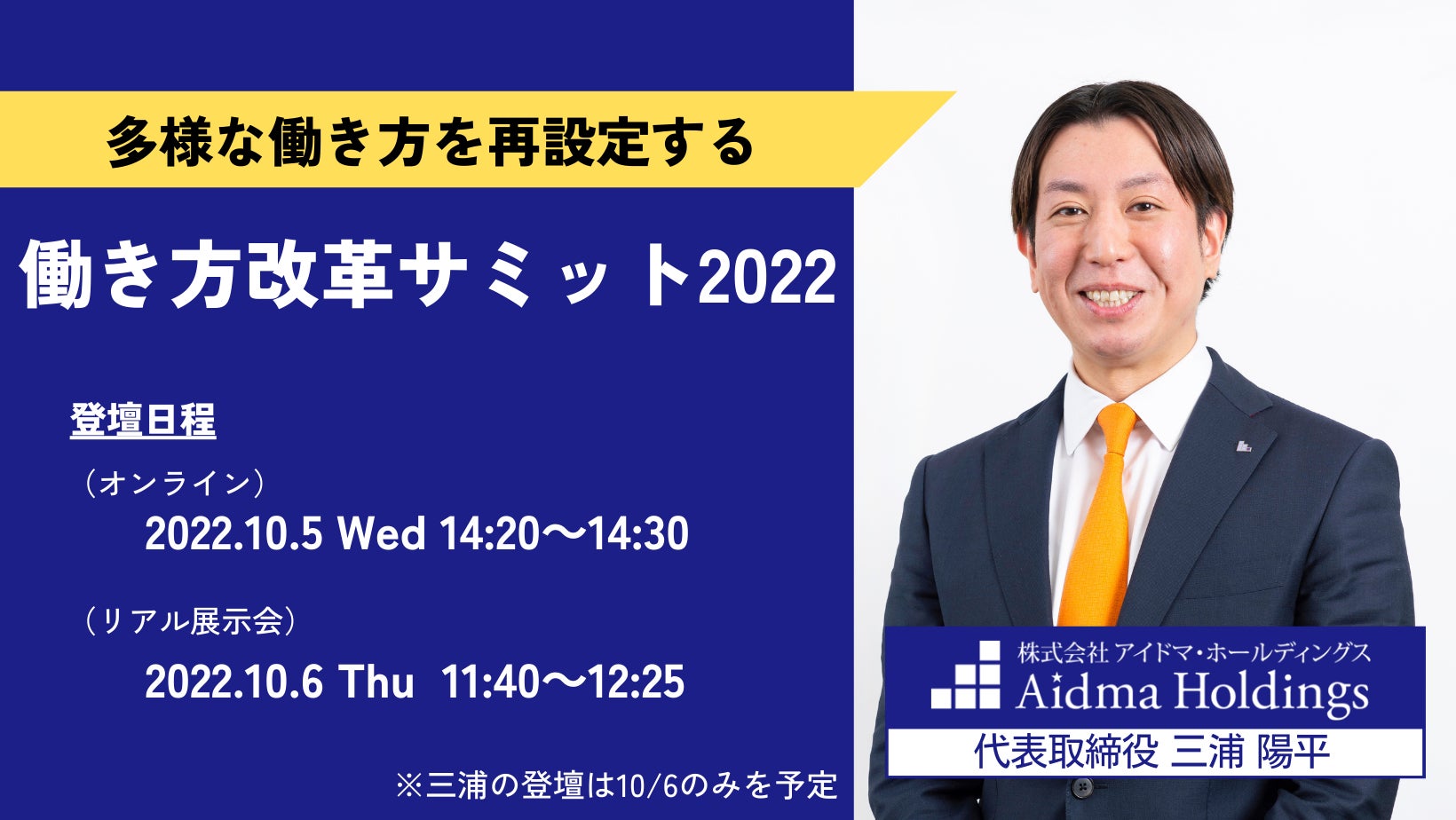 株式会社アイドマ・ホールディングス(本社:東京都豊島区、代表取締役:三浦 陽平、以下:当社)は、株式会社コミクスが開催する「働き方改革サミット2022」に当社代表取締役三浦が登壇することをお知らせします。当社はオンラインで開催する10月5日(水)14:20~14:30とリアルセッションの10月6日(木)11:40~12:25に登壇します。(三浦の登壇は、10月6日(木)のみを予定)