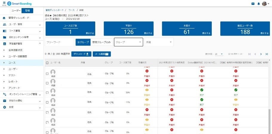 Smart Boardingにデフォルトで用意されている既存のコンテンツだけでなく、自社で作成頂くオリジナルコンテンツについても、誰がどのくらい受講しているか、学習の進捗状況を把握することができます。